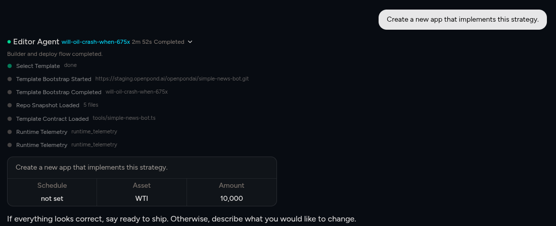 OpenPond AI then starts writing the agent for you.