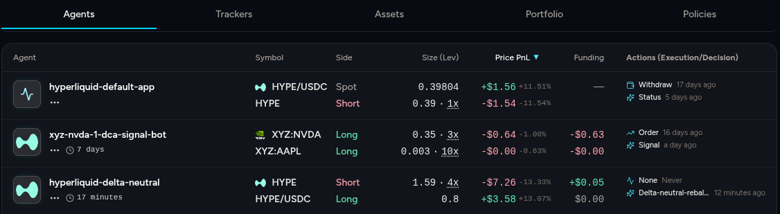 We also track granular agent events across decisions, execution, and lifecycle changes. That gives you a bird's-eye view into how the strategy is behaving in production, including funding and PnL tracking.